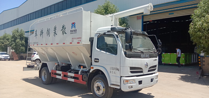 散裝飼料運輸車,散裝飼料車的飼料罐架設在卡車的底盤上,罐頂開有進料口.頂部的一根螺旋輸送卸料管(俗稱卸料絞龍)則可自由回轉和抬升,抬升的仰角可達60度。運輸時,頂部的螺旋管平臥在罐頂;卸料時則抬起,使管端的出料口與畜禽飼養(yǎng)場貯料罐頂部的進料門相接,駕駛室內裝有操縱裝置(操縱裝置也可裝置在罐體尾部),卸料時通過車底的動力輸出軸和減速器來驅動螺旋,以完成卸料。