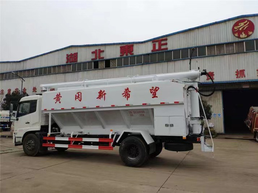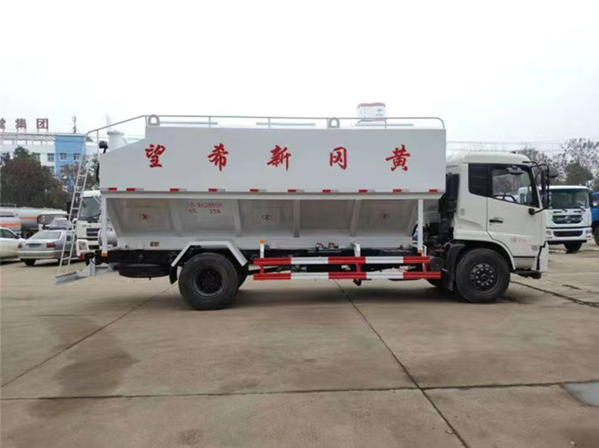 散裝飼料運(yùn)輸車,散裝飼料車的飼料罐架設(shè)在卡車的底盤上,罐頂開有進(jìn)料口.頂部的一根螺旋輸送卸料管(俗稱卸料絞龍)則可自由回轉(zhuǎn)和抬升,抬升的仰角可達(dá)60度。運(yùn)輸時(shí),頂部的螺旋管平臥在罐頂;卸料時(shí)則抬起,使管端的出料口與畜禽飼養(yǎng)場貯料罐頂部的進(jìn)料門相接,駕駛室內(nèi)裝有操縱裝置(操縱裝置也可裝置在罐體尾部),卸料時(shí)通過車底的動力輸出軸和減速器來驅(qū)動螺旋,以完成卸料。