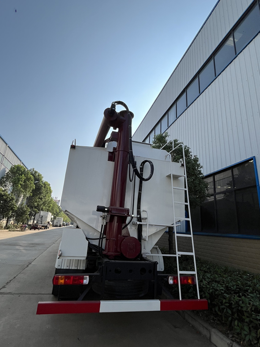 散裝飼料運輸車,散裝飼料車的飼料罐架設在卡車的底盤上,罐頂開有進料口.頂部的一根螺旋輸送卸料管(俗稱卸料絞龍)則可自由回轉和抬升,抬升的仰角可達60度。運輸時,頂部的螺旋管平臥在罐頂;卸料時則抬起,使管端的出料口與畜禽飼養(yǎng)場貯料罐頂部的進料門相接,駕駛室內裝有操縱裝置(操縱裝置也可裝置在罐體尾部),卸料時通過車底的動力輸出軸和減速器來驅動螺旋,以完成卸料。