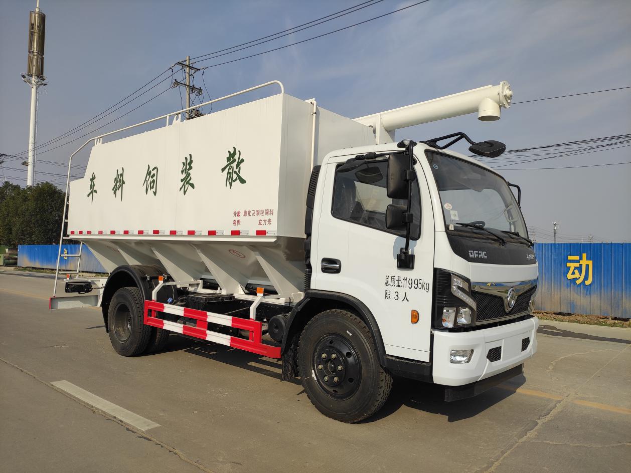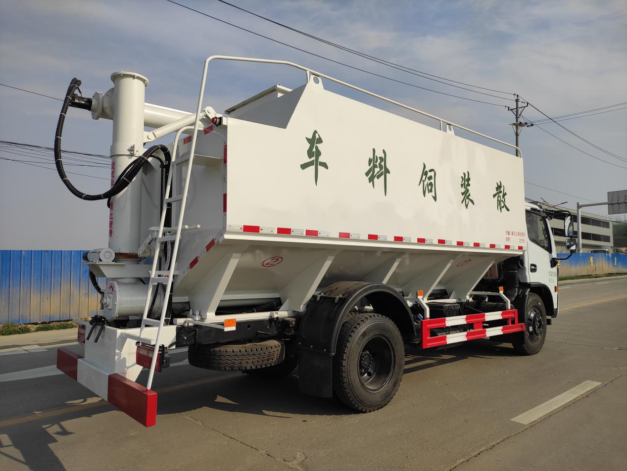 散裝飼料運(yùn)輸車,散裝飼料車的飼料罐架設(shè)在卡車的底盤上,罐頂開有進(jìn)料口.頂部的一根螺旋輸送卸料管(俗稱卸料絞龍)則可自由回轉(zhuǎn)和抬升,抬升的仰角可達(dá)60度。運(yùn)輸時(shí),頂部的螺旋管平臥在罐頂;卸料時(shí)則抬起,使管端的出料口與畜禽飼養(yǎng)場貯料罐頂部的進(jìn)料門相接,駕駛室內(nèi)裝有操縱裝置(操縱裝置也可裝置在罐體尾部),卸料時(shí)通過車底的動(dòng)力輸出軸和減速器來驅(qū)動(dòng)螺旋,以完成卸料。